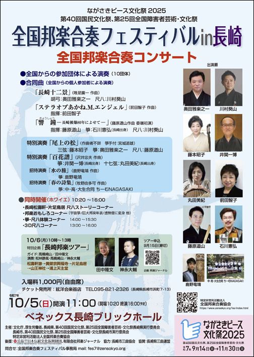 全国邦楽合奏協会が主催する邦楽コンサートです。お世話になっている演奏家が理事をしており、故郷だから出てみない?とお誘いを受けました。とても楽しそうなイベントで二つ返事で出演を決め、合同曲2曲に出演させていただきます。